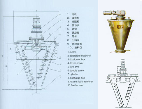又螺旋的公、自轉使物料在錐體內產生復合運動,主要產生四種運動形式; (1)螺旋沿壁公轉,使物料沿錐壁作圓周運動; (2)螺旋自轉使物料自錐底沿螺旋而上升; (3)螺旋的公、自轉復合運動使一部分物料被吸收到螺旋圓柱面內,同時受螺旋自轉的離心力作用 螺旋柱面內的一部分物料向錐體徑向排放; (4)上升的物料受自身重力作用下降,四種運動在混合機內產生對流、剪切、擴散,從而達到快速 均布混合的目的。